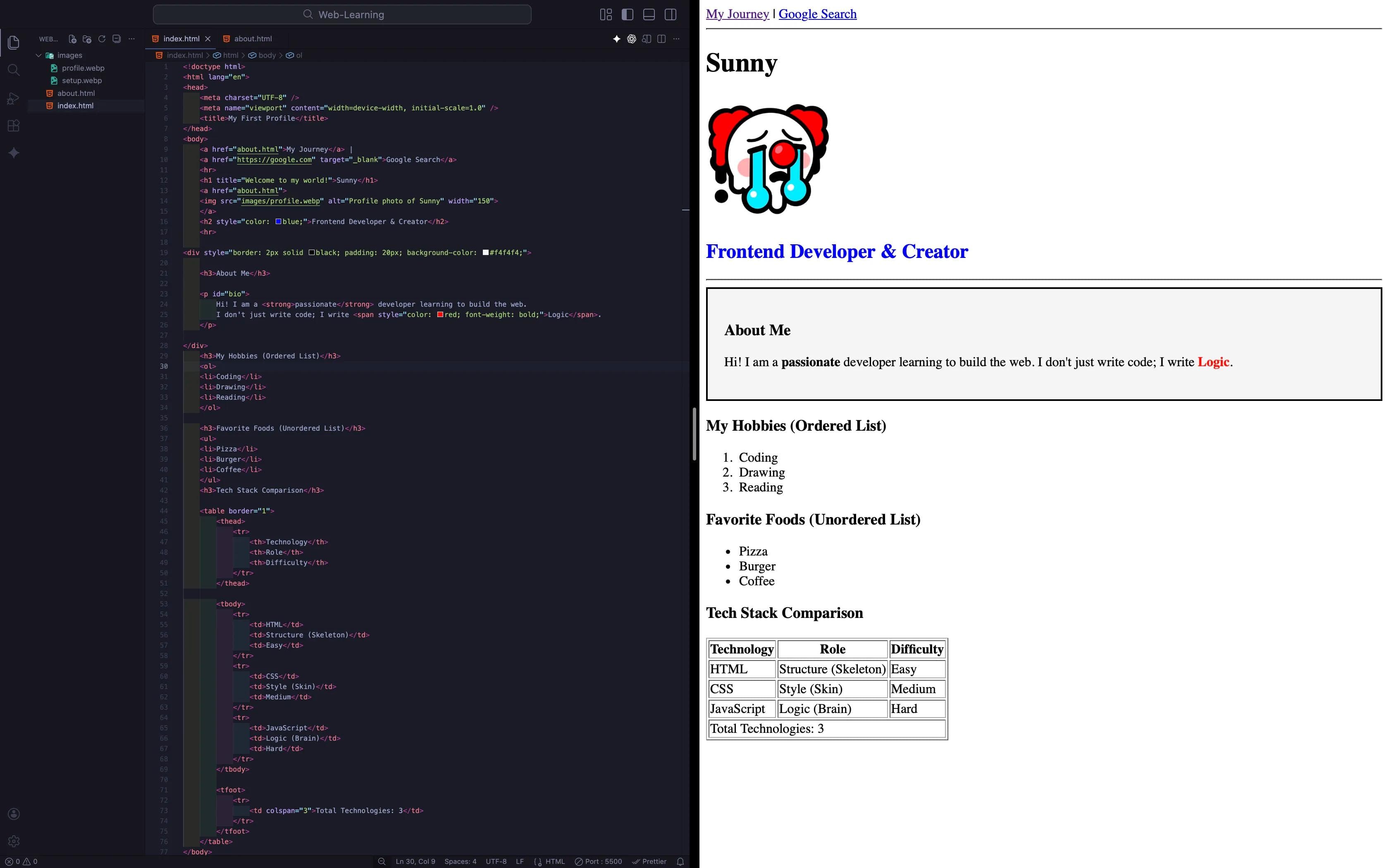 index.html. We will completely transform the "About Me" section into a Professional Profile Card.Update your code like this: