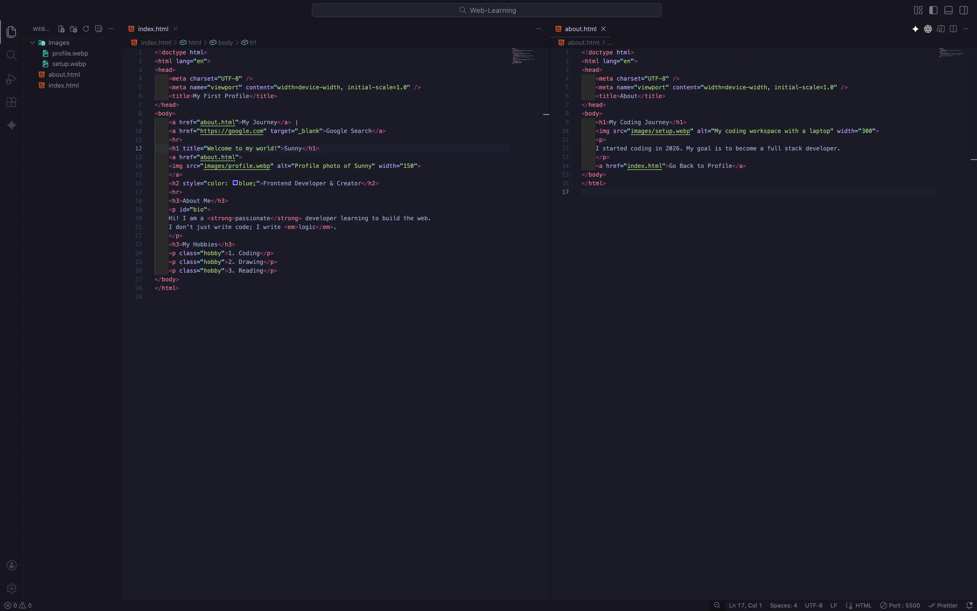 <img>tag inside your<h1>tag. Does it work? - Create a Mini Gallery: Try adding 2 or more images side-by-side. Make one of them clickable (link it to Google) and keep the others as plain images. See how they stack up on the screen!
