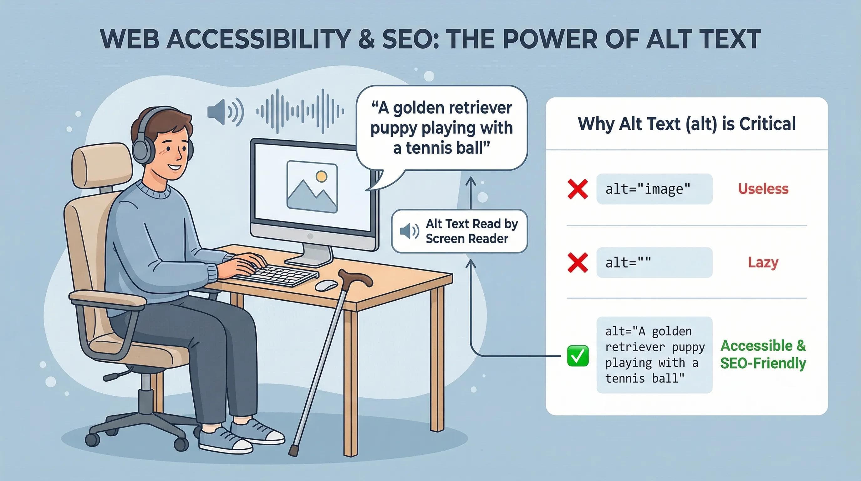 alttext out loud to them. - Broken Images: If your image fails to load (slow internet), the text shows up instead.