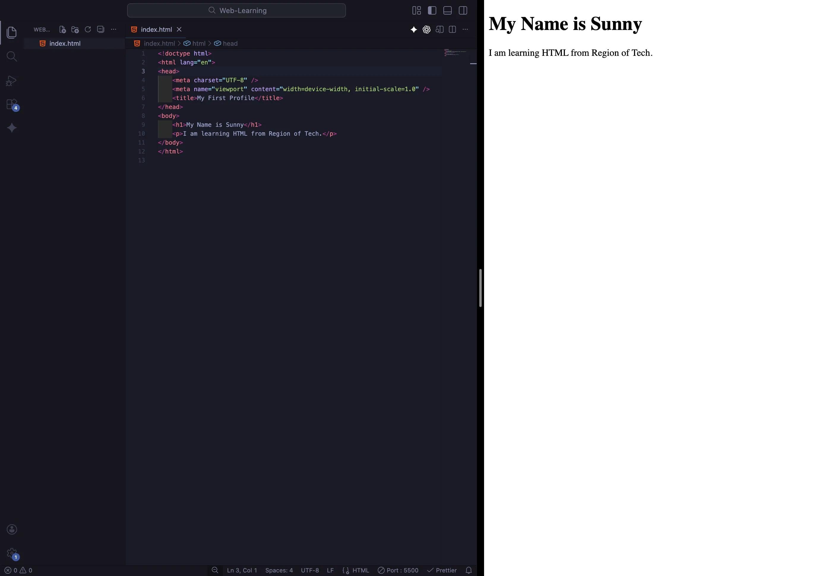 <p>I am learning HTML from Region of Tech.</p>3. Save & Check: Save the file and look at it with Live Server.