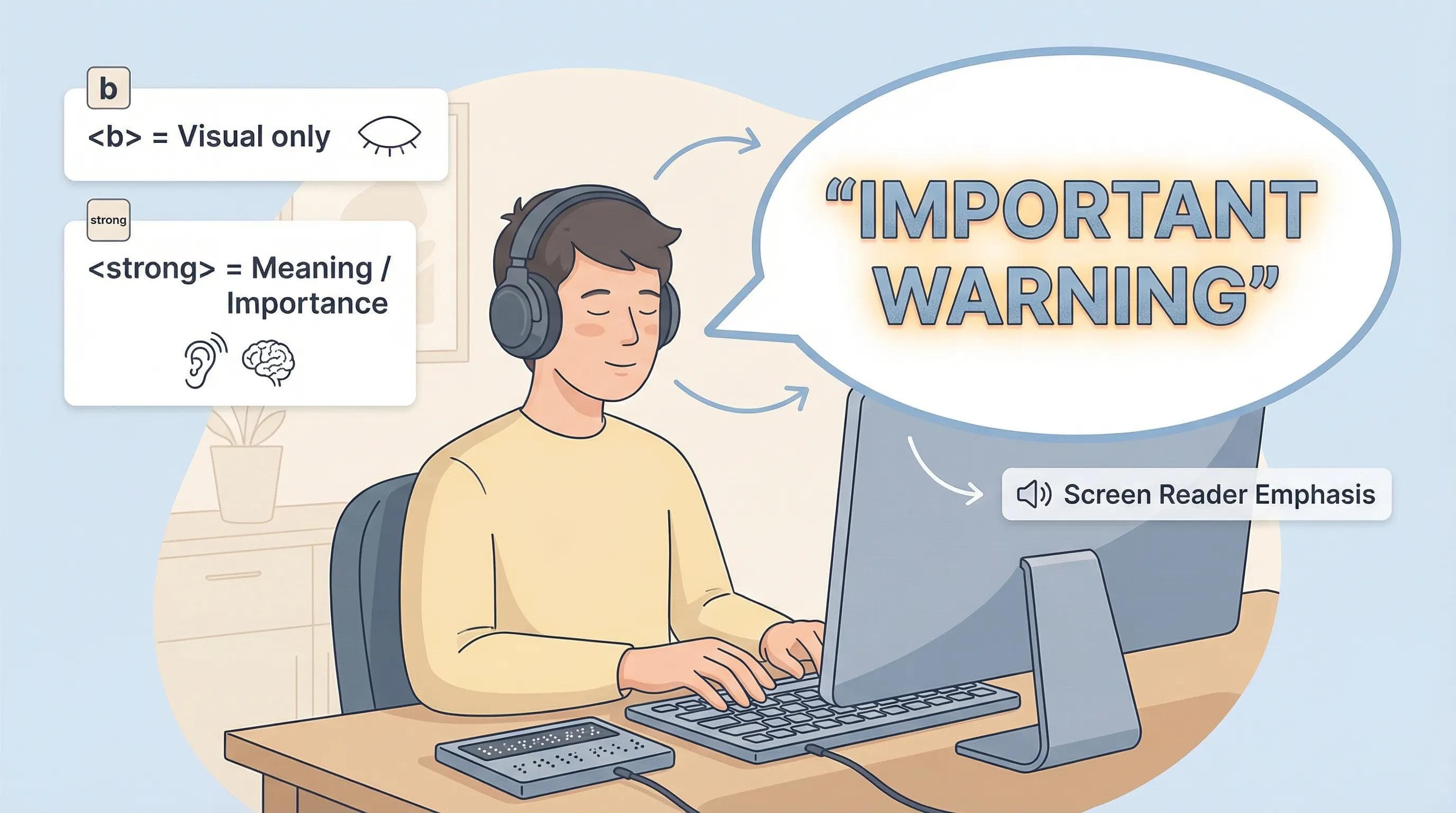 <b>: It is purely visual. It says, "Make this ink thicker."<strong>: It is semantic. It tells Google and Screen Readers (for blind users): "This word is URGENT/IMPORTANT."
